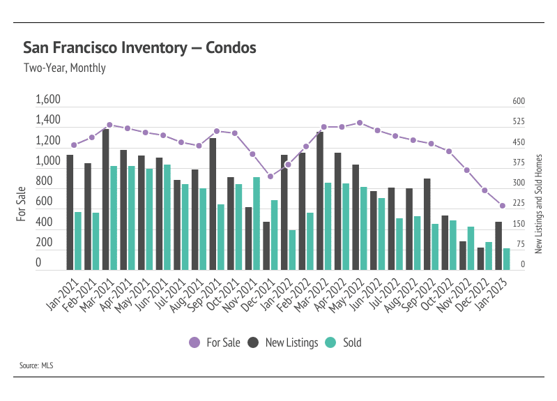 The San Francisco housing market is once again near all-time-low inventory levels as far fewer new listings are coming to market.