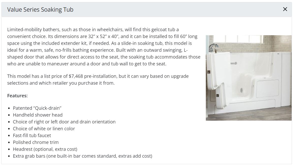 The number of models Independent Home carries isn’t overwhelmingly large. Yet, it manages to have options for many different body types and abilities and many different home space requirements. Some of Independent Home’s options are a slide-in tub, a shower-tub hybrid, a tub with a sling, a bariatric tub, and a cube-like tub that works well in small bathrooms.