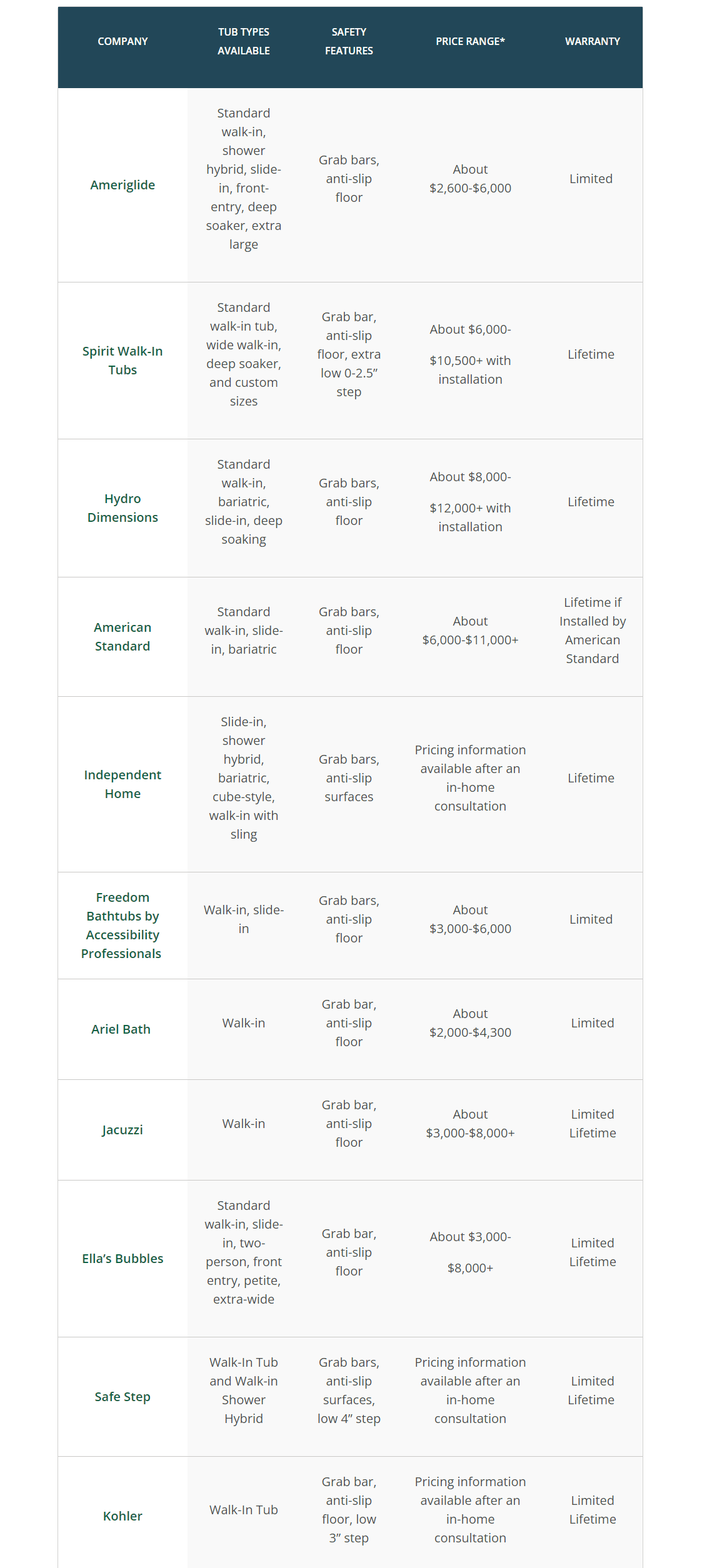 * Walk-in Tub pricing can be difficult to determine. Prices in this chart do not include installation unless otherwise noted.
