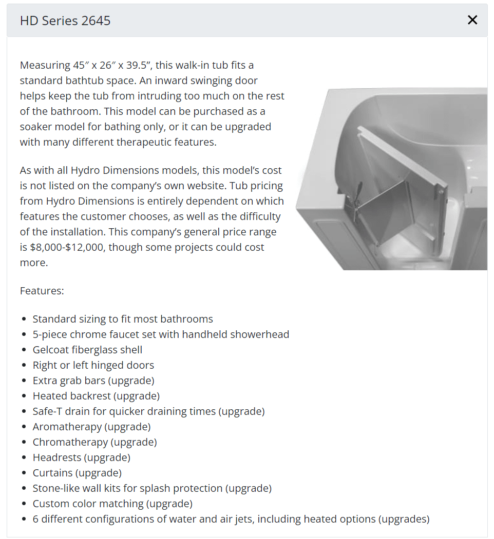 Even with upgrades, Hydro Dimensions tubs remain fairly reasonable, especially since their prices always include installation costs. Hydro Dimensions truly brings value to the walk-in tub market and makes top-quality therapy options accessible.