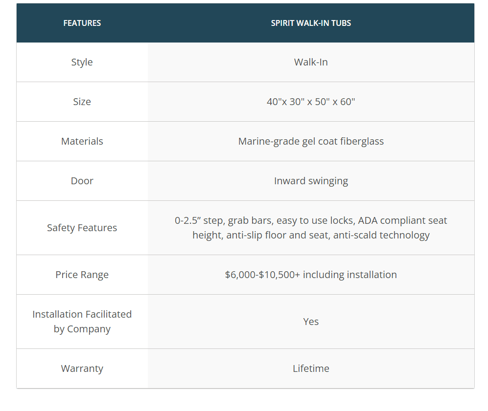 Spirit Walk-In Tubs are highly customizable, but they will generally measure somewhere in this range: 40″ x 30″ x 50″ – 60″. Extra-wide, deep soaking, petite, and two-person models are typically available. All Spirit walk-in tubs are crafted from a seven-layer marine gel coat fiberglass and made without internal frames but are pretty stable. Unlike tubs with frames, these sit directly on the floor, enabling them all to have a 2.5″ or lower step, compared to steps of 3″ -9″ in other walk-in tubs. Seniors looking for more information on the quality construction of Spirit Walk-In Tubs may call the company or look directly at the manufacturer’s website (BOCA Walk-In Tubs).