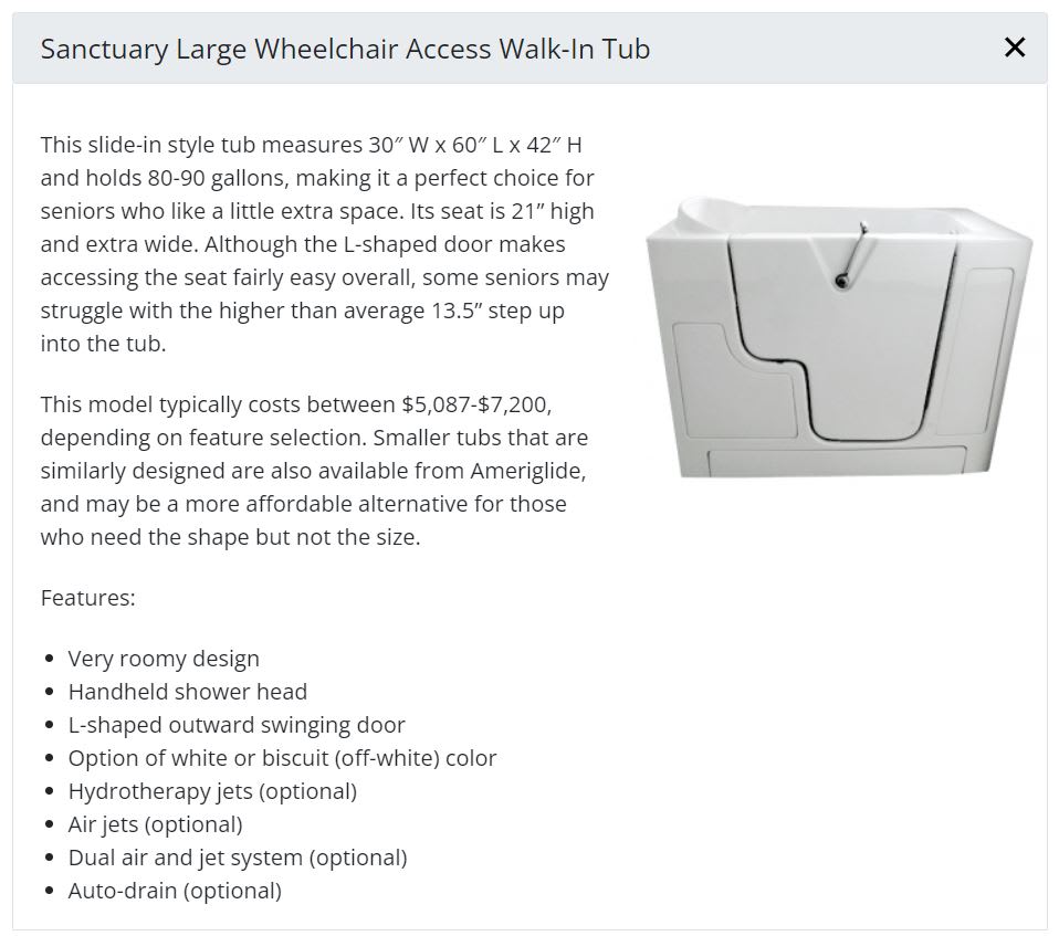 We’ve reviewed four of Ameriglide’s walk-in tubs: a mid-sized model with fairly basic features, a larger deluxe model, a large wheelchair-accessible model, and a model that includes a shower enclosure. These four tubs show some of the variety this company offers, but several more great options are available, including extra large and extra small options.