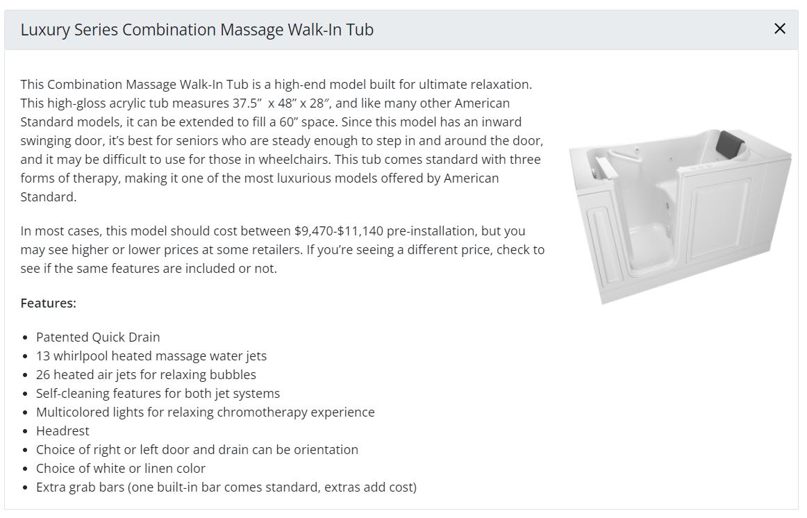Now American Standard helps consumers with the next wave of home improvement- making homes accessible to the elderly and disabled. This company offers a large selection of walk-in tubs at a variety of price points and styles. Since the cost of every tub and its upgrades are clearly labeled online, American Standard takes the guesswork out of comparison shopping and makes life that much easier for buyers.