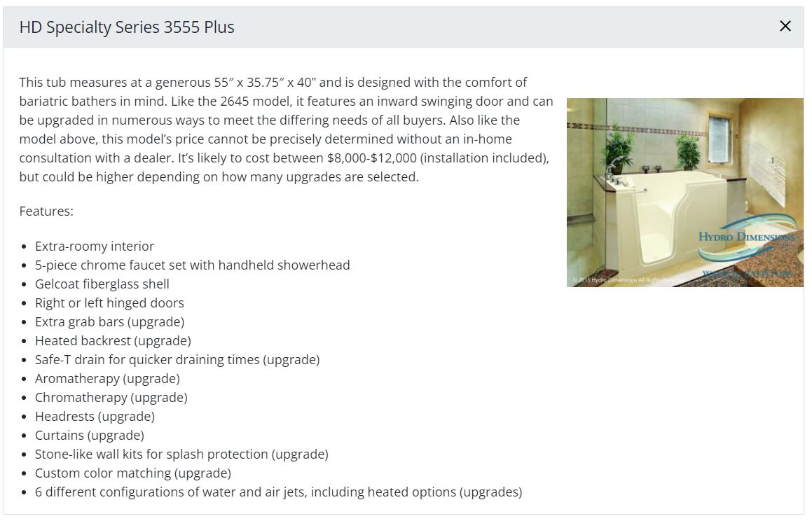 Hydro Dimensions, an innovator in the walk-in tub industry since the early 1990s, offers sixteen different walk-in tubs in two different product lines: the HD Series Line and the Specialty Line. Between the two lines, there are 17 different models. We’ve reviewed a tub from each line so that you can get an idea of what’s offered, though there are many other models available. In general, the tubs in the specialty line are larger than average or are built for those with limited mobility.